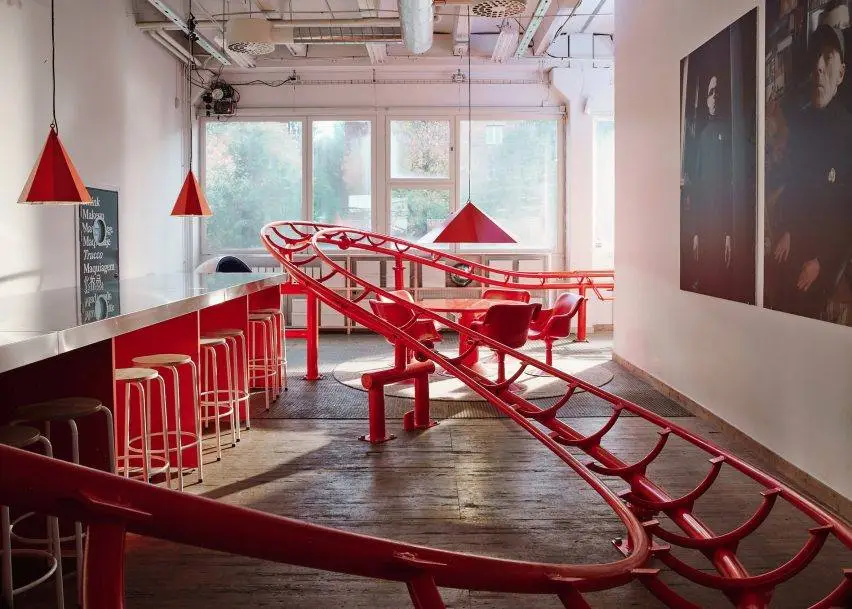 這座雲霄飛車以紅色烤漆鋼材構築而成,沿著辦公室中央環繞廁所,支撐架則直接固定在地板上。雲霄飛車的軌道被升高至 4 公尺,透過動力裝置推進,經過廚房區、辦公室入口,並穿越座位區,環繞著中央圓桌,再回到起點。